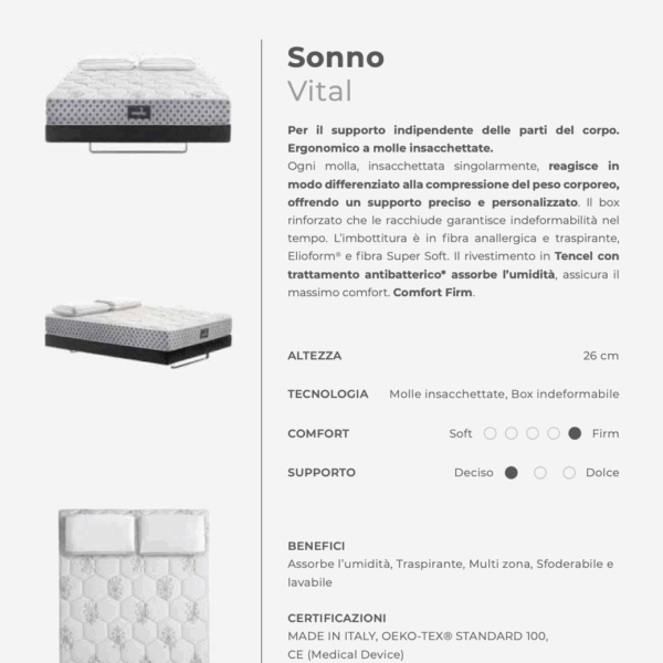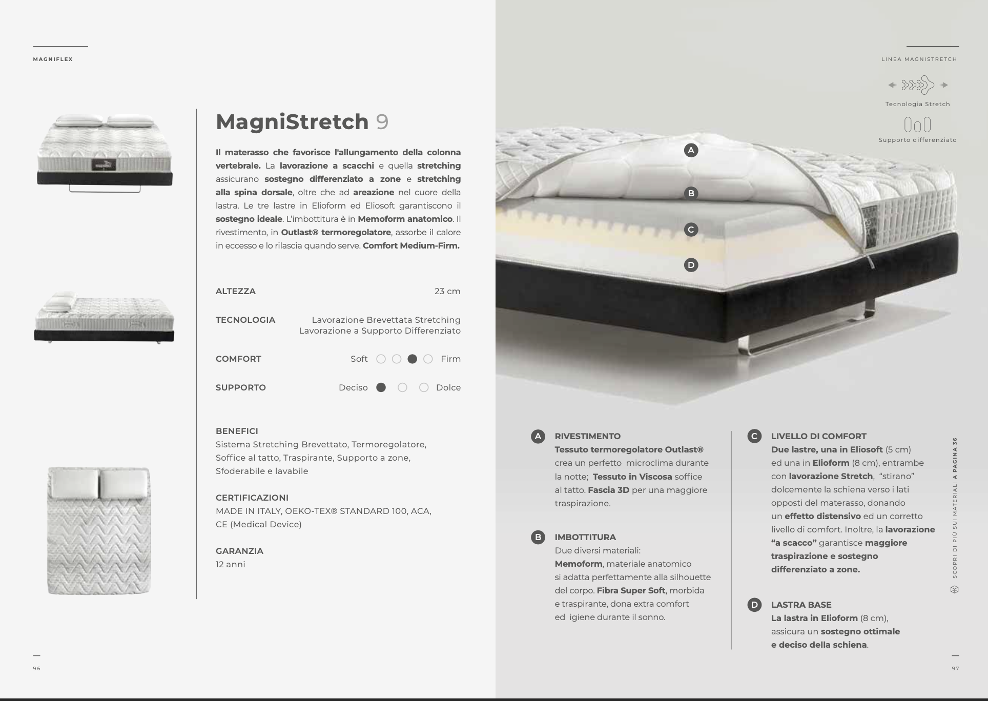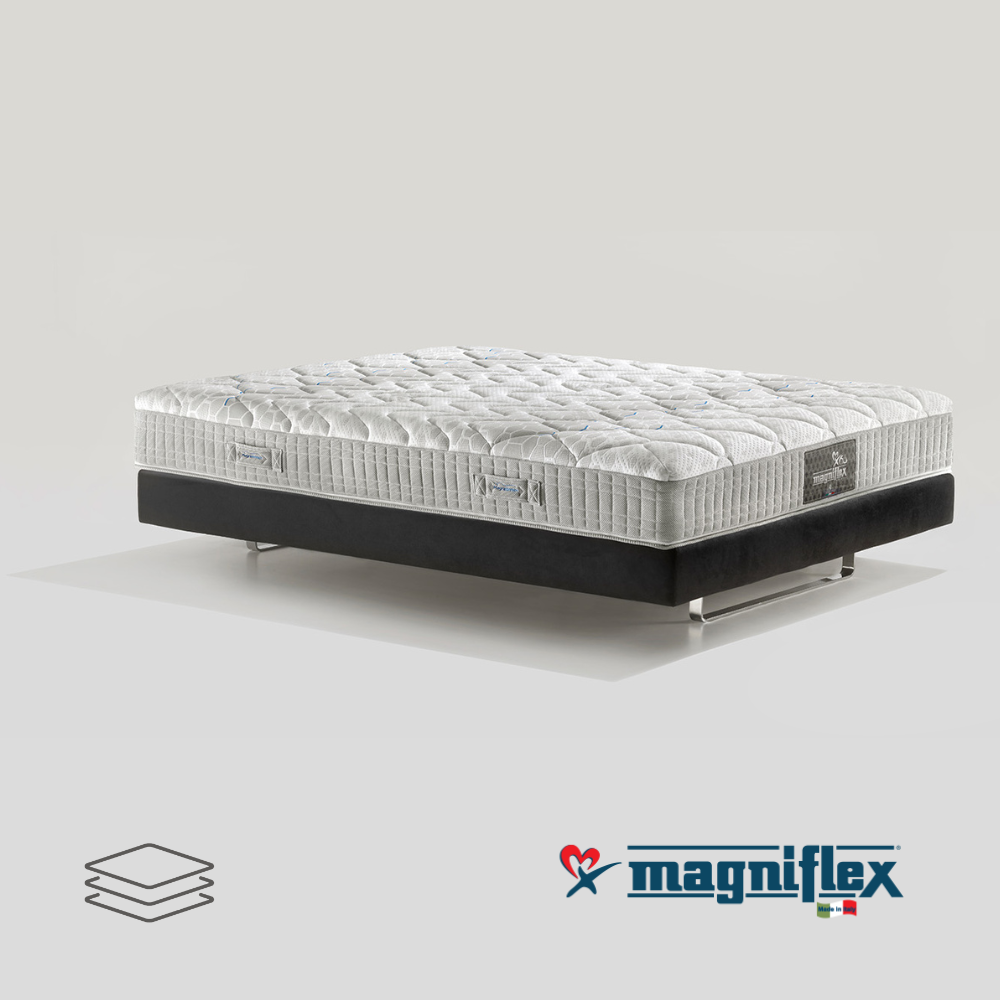 La lavorazione a scacchi e quella stretching assicurano sostegno differenziato a zone e stretching alla spina dorsale, oltre che ad areazione nel cuore della lastra. Le tre lastre in Elioform ed Eliosoft garantiscono il sostegno ideale. L’imbottitura è in Memoform anatomico. Il rivestimento, in morbida viscosa e Outlast® termoregolatore, assorbe il calore in eccesso e lo rilascia quando serve. Comfort Medium-Firm.