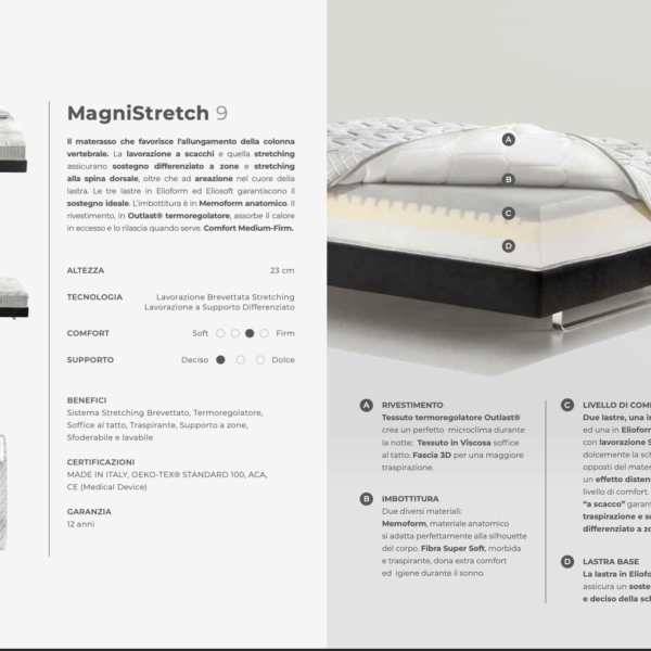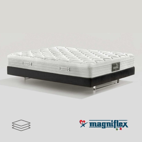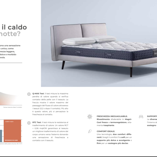 L’esclusivo tessuto Magnicool, innovativo e termoregolatore, grazie alle migliaia di micro-particelle di materiali silicati distribuite tra le fibre, garantisce un’istantanea sensazione di freschezza. Tessuto fresco, soffice al tatto, dissipa l’umidita? garantendo massima traspirazione.