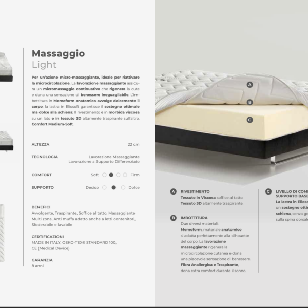 Memoform® è il più anatomico tra i materiali utilizzati, ed è studiato per reagire al peso del corpo e per adattarsi perfettamente a ogni silhouette. Questa sua proprietà offre una piacevole sensazione di agio e leggerezza durante il riposo, e dona beneficio al rilassamento della spina dorsale